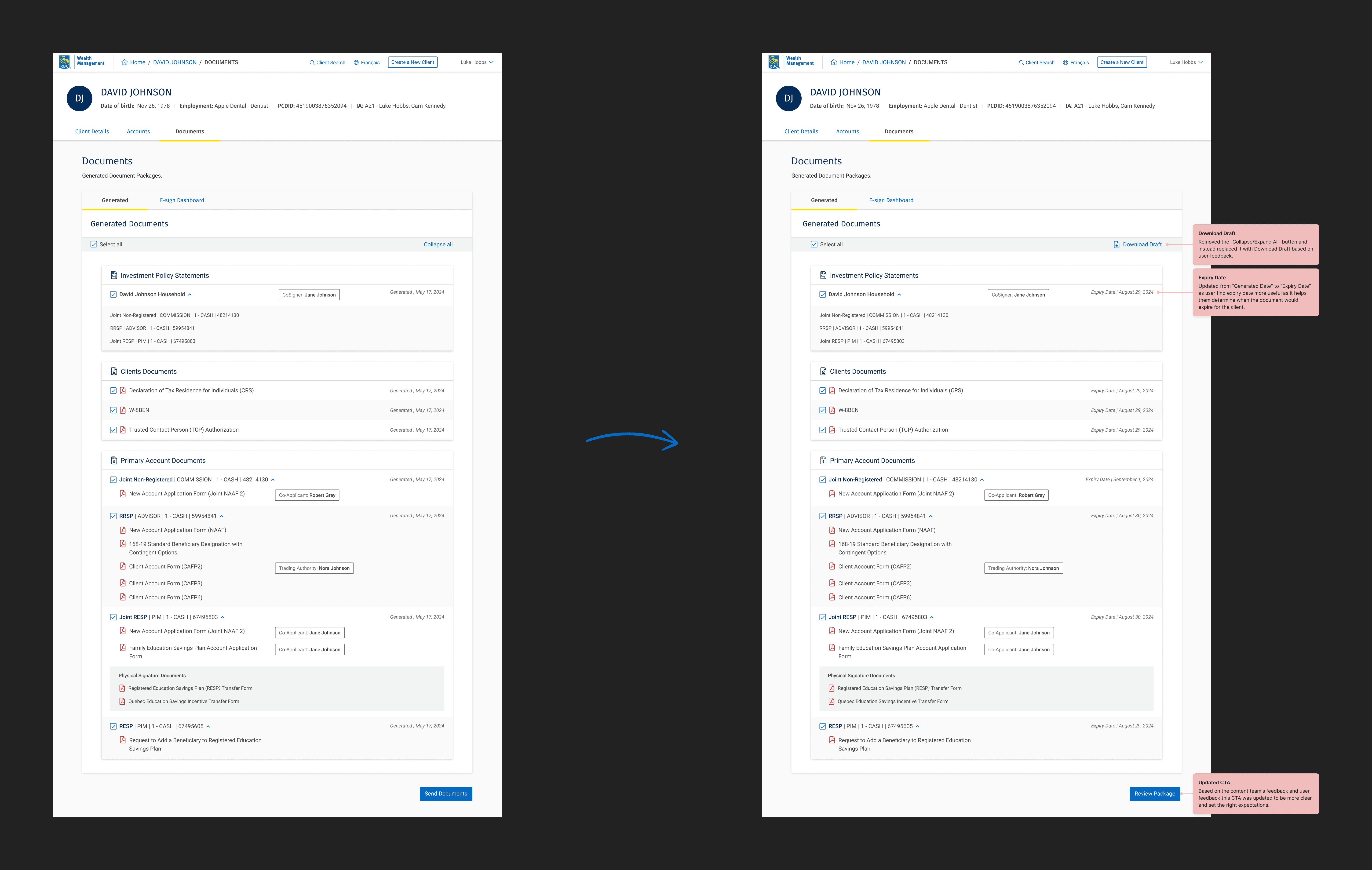 Design Rationale: This hub consolidates all client and account documents for the entire household. Based on testing feedback, documents are expanded by default to provide immediate visibility and context, eliminating the need for manual discovery.